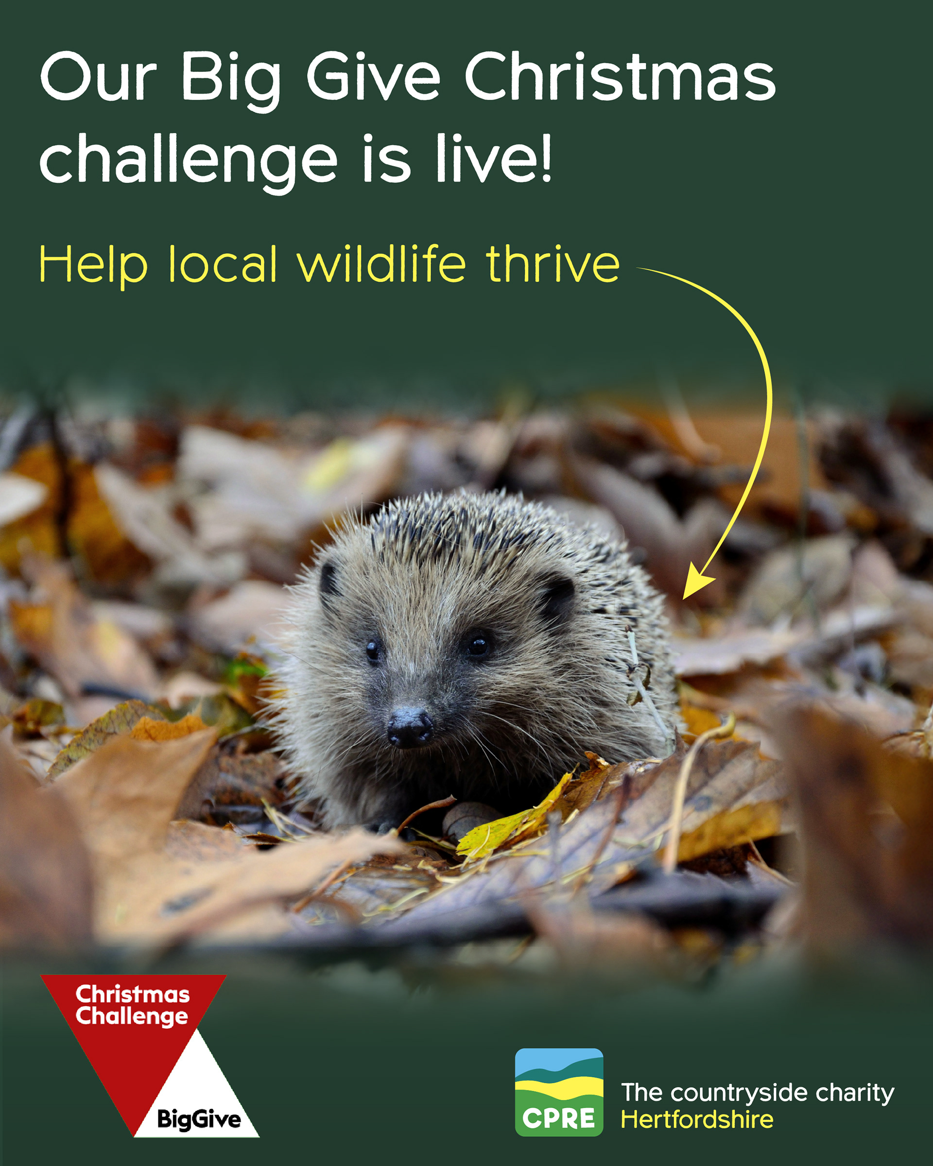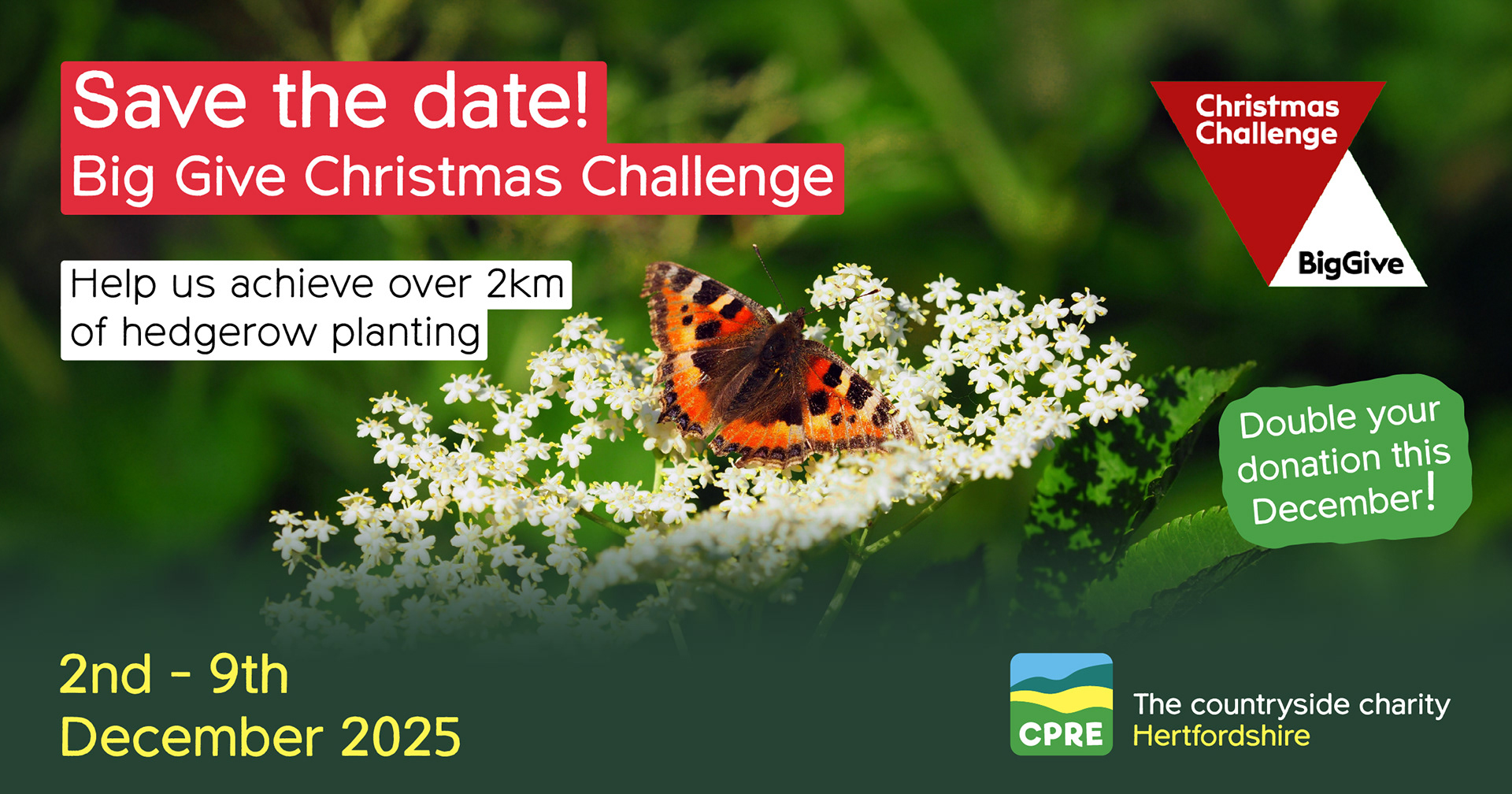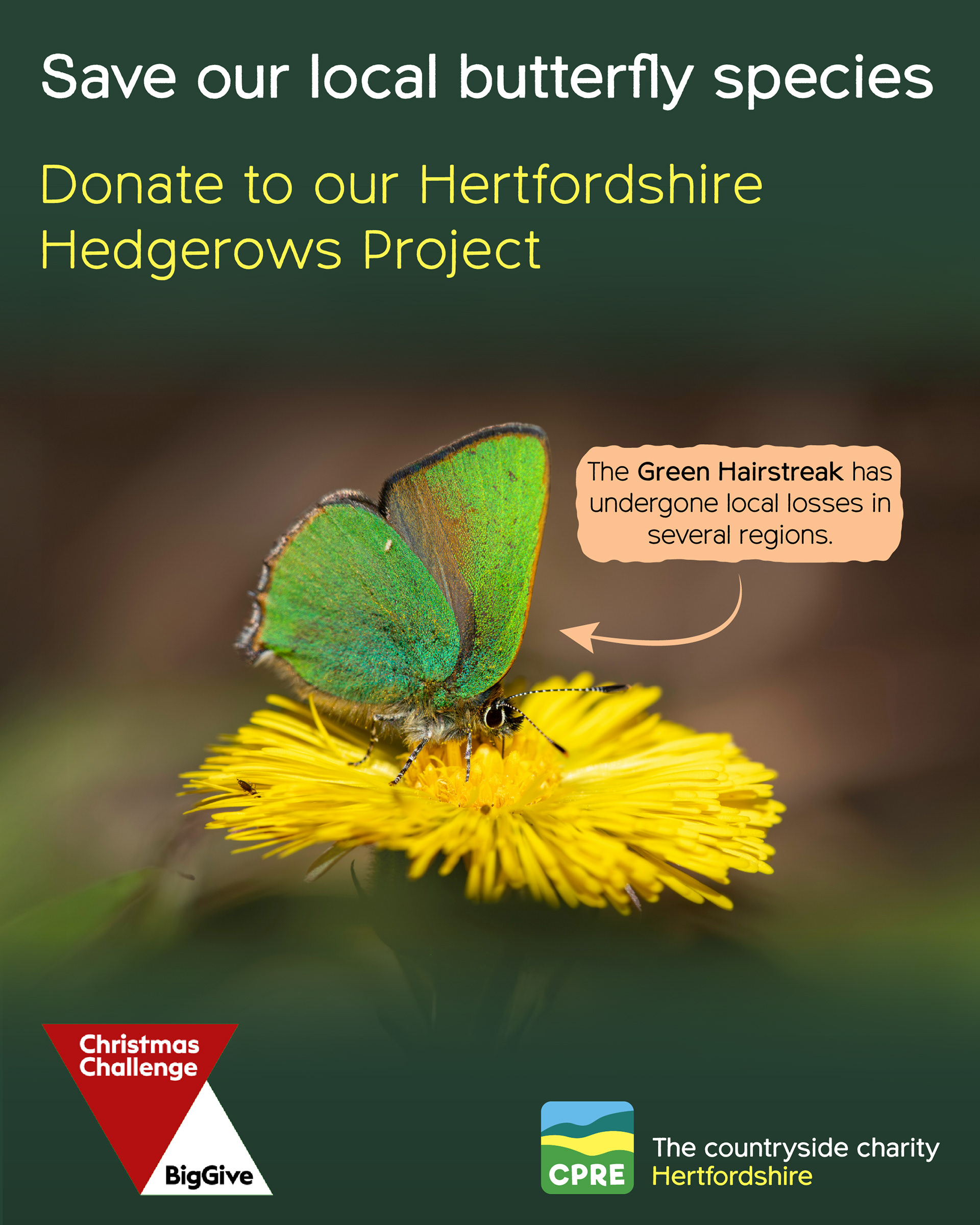 I was asked to design a set of impactful digital banners and social media images for a fundraising campaign centered around hedgerow loss in the UK. The campaign aimed to raise awareness of the environmental importance of hedgerows, both as biodiversity hotspots and as natural carbon sinks and to encourage public donations during the Big Give Christmas Challenge.